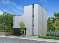 キューブとスリットで構成されているシンプルな外観です。 内部には2層に中庭を配し、光を取り入れるとともに独創的な憩いの場を提供しています。 ビルトインガレージも多目的に利用できるプランです。 ■特徴:ビルトインガレージ付き / 2階リビング ■テイスト:シンプルモダン