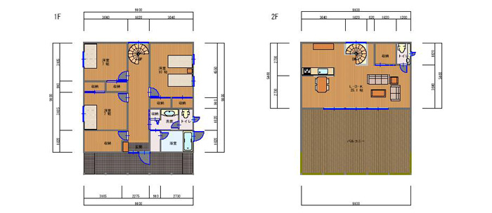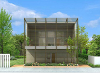 1階から螺旋階段を上がると、明るいリビング・ダイニングと広いバルコニーが一体化して現れます。 ファサードの木ルーバーが「簾」のように領域を緩やかに規定し、内部と外部が融合した、落ち着きのある空間を造っています。 ■特徴:納戸 / 2階リビング ■テイスト:シンプルモダン